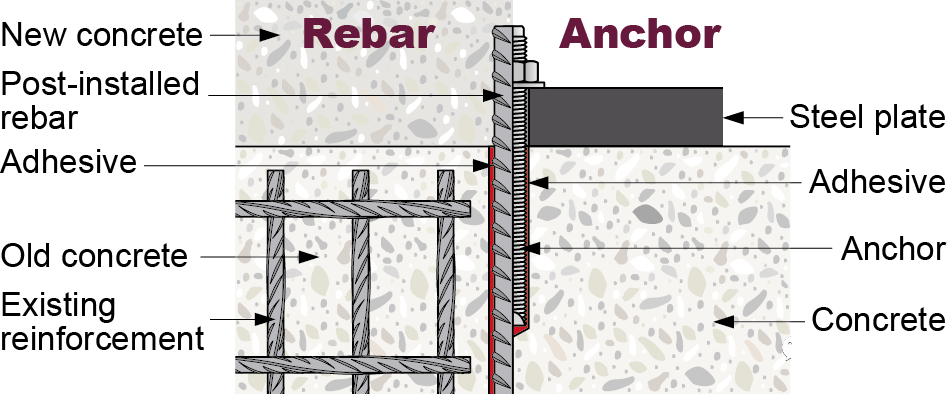 在錨栓理論中,來自鋼構(gòu)件(梁或柱)的荷載通過錨固定在混凝土上的錨板傳遞到混凝土結(jié)構(gòu)上。固定件的鋼構(gòu)件(粘合劑的螺紋桿)通過拉伸荷載或剪切荷載或兩者的組合將荷載轉(zhuǎn)移到現(xiàn)有混凝土構(gòu)件上。利用混凝土的固有抗拉強(qiáng)度是加固抵抗荷載的必要條件,這意味著脆性混凝土錐體破壞在錨栓理論設(shè)計(jì)中是可以接受和考慮的。