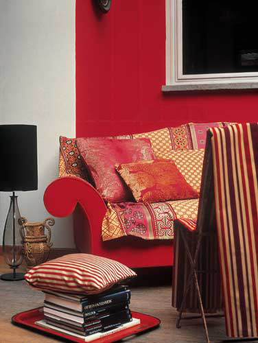 即使是西式的家居布置,同樣可以選用艷麗的東方風(fēng)格布藝做裝點(diǎn)。東方艷麗風(fēng)格布藝的紅色恰好與空間里的紅色墻壁、沙發(fā)屬于同一個色系,搭配出十分和諧的效果。西亞的建筑圖案與中國的傳統(tǒng)紋樣疊在一起使用,并且搭配了材質(zhì)相近、顏色相似的條紋布藝作為橋梁,令東方艷麗的風(fēng)格更為突出,與居室整體的風(fēng)格也更加諧調(diào)?!?br />