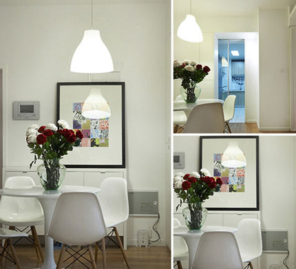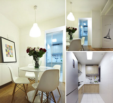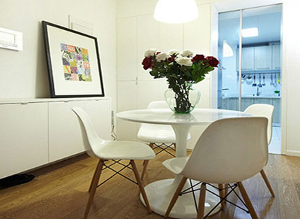 白色墻材、白色的餐桌椅,不怕再多加上幾件白色的家居用品,因為不同立面的材料在疊加之后有了神奇的立體效果,而光影的變幻則會給人帶來豐富的感官效果