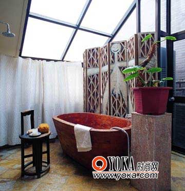 將露臺改成浴室,明亮的天頂采光,放在浴室中間的木質(zhì)浴盆,粗獷的石材地面以及帶有強烈的民族圖騰式裝飾紋樣的屏風,組合成質(zhì)樸、渾然天成的原生態(tài)氛圍。這種風格的設(shè)計靈感,最初來源于廣袤的非洲大地,原生態(tài)風格的居室出現(xiàn)在都市住宅里,使都市新貴尋覓到返樸歸真的自在空間。