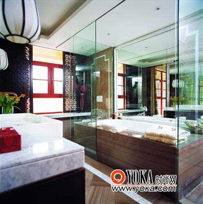 厚重的石材與輕盈的玻璃讓衛(wèi)浴間充實而簡潔,沒有過多的裝飾,而用中式的雕花窗扇來營造濃郁的浪漫風情。透過雕花斑駁的光影,原本直白的光線變得富有情調(diào),簡練與柔媚,兩種不同的風情因為陽光的融入,巧妙地結(jié)合在一起。而木質(zhì)窗扇既不怕水又能透光,是布藝窗簾所不能比及的。