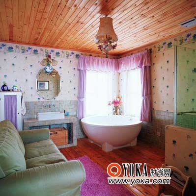 有人說浪漫與實用不能兼得,現(xiàn)在你要改變這個看法。在不同的材質(zhì)、不同的風格中自然過渡,就可以讓浴室在原有的使用功能不被破壞的同時兼具童話般的效果。墻面的下半部用瓷磚代替了壁紙,可以延長壁紙壽命、方便清潔;木地板與木質(zhì)頂棚的介入可以彌補瓷磚的冰冷,讓原本觸感堅硬的四壁舒適溫馨。
