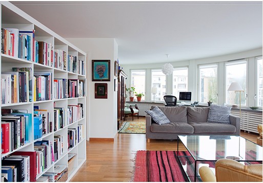 客廳一側(cè)不起眼的純白書架, 塞進(jìn)上五顏六色的書籍立刻不一樣了起來。