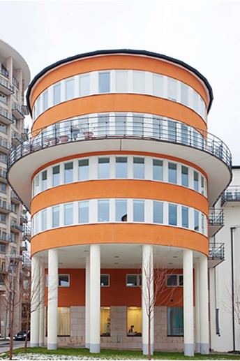 整體建筑設(shè)計(jì),可以看到側(cè)面的陽臺。沿半圓弧排列的16扇圓窗會給你震撼和溫暖。