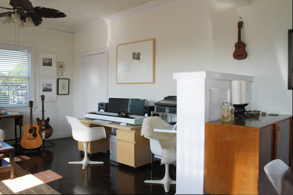 將客廳的一角做為工作室,沒(méi)有單獨(dú)隔起來(lái),一是因?yàn)榭臻g不夠,二來(lái)也不用,都是安靜的人,不會(huì)相互干擾到。