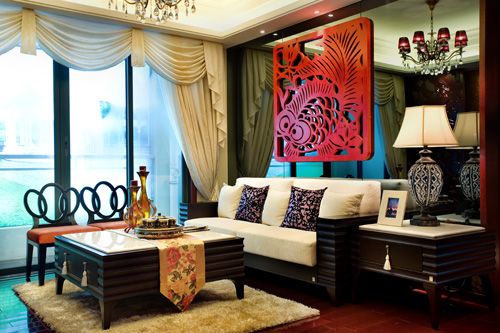 客廳沙發(fā)背景墻的剪紙藝術(shù)設(shè)計,室內(nèi)裝飾品擺設(shè)著民間漆雕工藝,及琉璃和仿古家私都展示出中式風格設(shè)計風采。