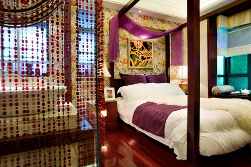 白色的床上用品,紫色的布幔,紫色珠簾,墻面的花紋墻紙。它們的組合讓主臥帶有一點“香艷”的味道。