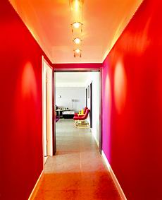大膽地應(yīng)用了亮紅色,一進門就可以感覺到濃濃的暖意,但設(shè)計師建議在走廊的兩邊懸掛主人的一些有回憶的照片,增加一下情調(diào)。