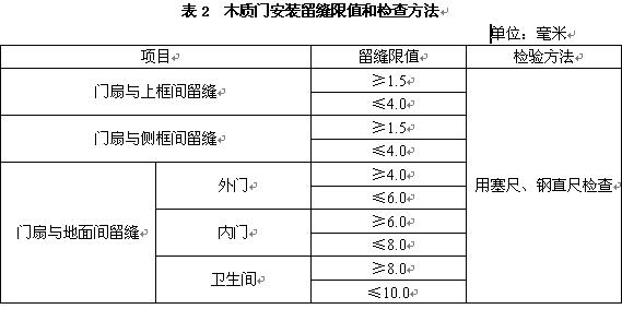 ——檢查門(mén)套與扇截口及門(mén)套線結(jié)合處高低差;門(mén)扇與門(mén)框、扇與扇接縫高低差是否符合表2中的要求;門(mén)扇與上框、側(cè)框、地面間留縫是否符合表2要求。