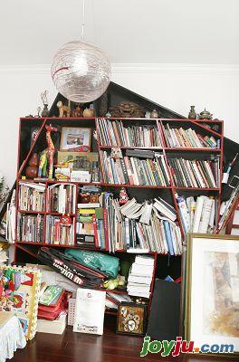 走進(jìn)胡菲家里,還沒等看清楚大概的樣貌,首先就被引入了靠里側(cè)的書房。房間不大,一打開門,迎面就撞見一整面書架。兩個方形交錯疊置的樣子,以及整體黑色油漆底色上,內(nèi)層方形的邊框與隔斷被刷成跳躍的紅色,使它乍看起來好似一個碩大的藝術(shù)裝置,懸掛在正對著門的那面墻上。胡菲和先生都是老師,對書籍的愛好自不待言,而對書架的要求則是希望使它本身就能表現(xiàn)出某種藝術(shù)感覺。因此胡菲自己設(shè)計了這樣一個特別的樣子,延請工匠師傅來做??梢韵胍?,溝通上花費(fèi)了不少力氣,好在她自己能畫圖樣,雖然最后做出來尺寸略有出入,兩個方形并非同等大小,不過對本身便有交錯感覺的書架而言,不對稱亦是一種韻律。等工匠師傅刷好黑色油漆做底之后,胡菲又自己動手,給中央的方形和隔斷刷上紅色油漆。配色的靈感當(dāng)然源自她繪漆畫的感覺,那種手工的痕跡看起來也頗有趣味。