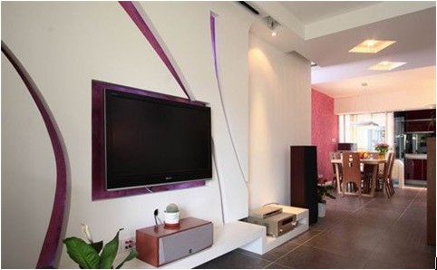 白色的電視背景墻面設(shè)計(jì)出幾條略帶藝術(shù)感的紫色波紋,在整個(gè)居室起到一大亮點(diǎn)。溫馨的空間內(nèi)加入了一絲活潑的氣息。
