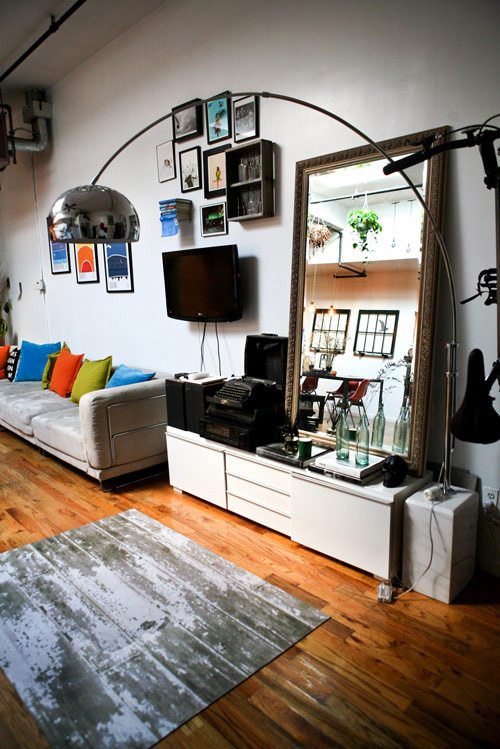 圓形的立柱燈和方形鏡子完美組合,呈現(xiàn)出的立體感給人以強烈的視覺沖擊。大塊的鏡子還能讓客廳的空間在視覺上有所擴大。掛墻的電視還能節(jié)省電視占據(jù)空間的位置。