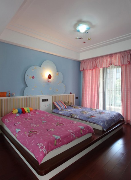 兒童房:兒童房設(shè)計體現(xiàn)其人性化設(shè)計的一面。地面略抬高,以形成榻榻米式雙人床。直角處都進行圓滑處理,以增加其安全性。兩張小床放在一起,以使孩子之間的活動更加方便。墻面背景的造型既色彩豐富,又飽含童趣。