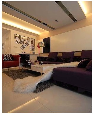 紫色一直就有一種浪漫、神秘、高貴而且唯美的感覺(jué),客廳選用的深紫色沙發(fā),給人一種高貴的美感,搭配白色的皮草和棕色的地毯,溫馨中帶有一份神秘的色彩,布藝的質(zhì)感溫暖舒適,很適合冬天。
