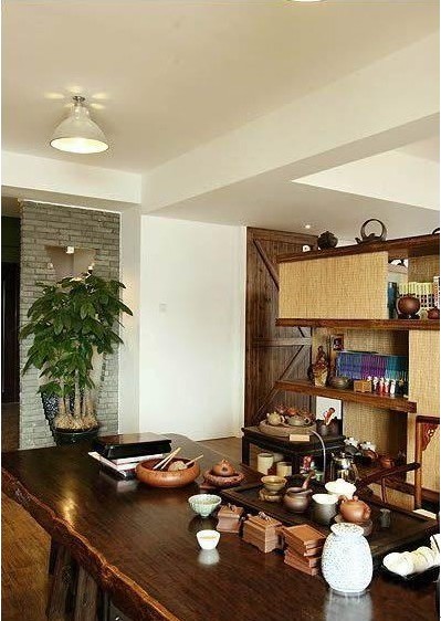中式裝飾品,幾只陶藝品和文房四寶,讓粗樸、厚重的案臺頓時變得輕靈起來,整個家顯得莊重沉穩(wěn)卻不繁瑣。