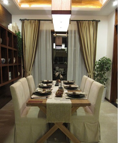 新中式元素的裝飾風(fēng)格體現(xiàn)的是素雅的氣質(zhì),因?yàn)閺闹锌梢燥@示主人的喜好與品位;餐桌餐椅很普通,但是餐具的擺放,中央素雅餐布幾件餐桌飾品彰現(xiàn)餐桌文化;咖啡色澤色柜子擺放著藍(lán)白瓷器,淡米黃色的窗曼柔和雅致;不張揚(yáng),不簡單卻透**深博大的氣息,著或許就是新中式風(fēng)格(或者是新東方乃至新亞洲風(fēng)格)的精髓所在。