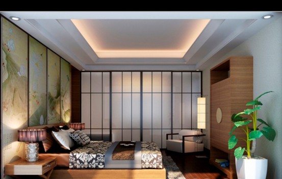東方元素的水墨國畫統(tǒng)攝了室內(nèi)清新婉約的氛圍;磨砂玻璃的移門有增添了空靈迷蒙的氣芬;中式古典的燈具、床上用品與家具令人感覺清新脫俗;