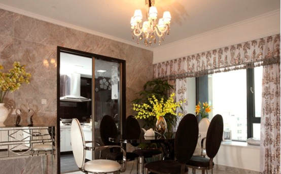 餐廳的家具、窗簾均以新古典風(fēng)格展現(xiàn);金色墻紙隱約的體現(xiàn)時(shí)尚的氣質(zhì);