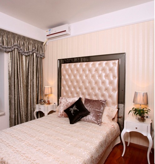 新古典風(fēng)格的床背顯得霸氣奢華;2個(gè)景致床柜、金銀黑色枕頭與灰金色的窗簾則體現(xiàn)新古典的溫情一面;