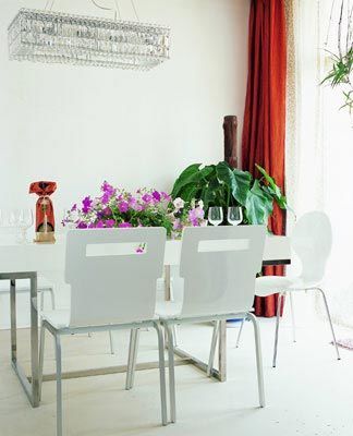 客廳與餐廚空間是開放貫通的,白色的鋼架桌椅,剔透的水晶吊燈和酒具,一捧盛放的鮮花,格外養(yǎng)眼。