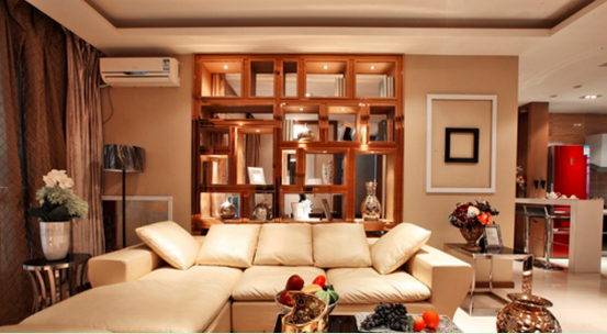 客廳沙發(fā)背景隔斷的形式與中式有某種神似,但是在材質(zhì)上與形體尺寸上都做了創(chuàng)新變異,在構(gòu)架上有了突破;在家具與配飾上還是以現(xiàn)代感的調(diào)子出現(xiàn);