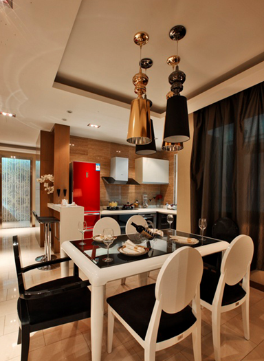 現(xiàn)代風(fēng)格是對古典的解放,現(xiàn)代的裝飾線條是簡單明朗的,如同白色的餐桌的款式一樣--------大方;吊燈無疑是極至現(xiàn)代;