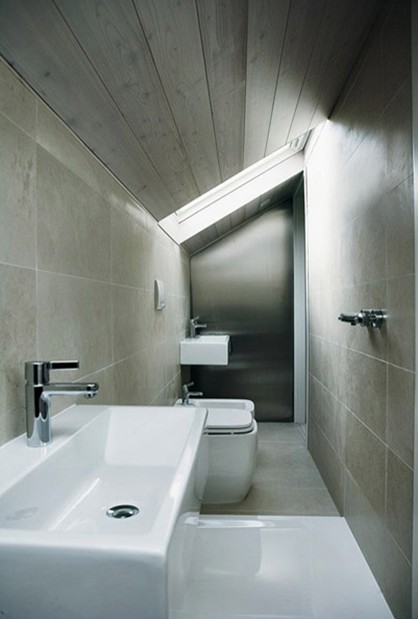 狹長(zhǎng)的衛(wèi)浴間空間,純白的潔具與四周略顯灰色的墻壁形成強(qiáng)烈的色彩對(duì)比,銀白色水龍頭與日光燈點(diǎn)綴緩解了空氣中的沉郁氛圍,簡(jiǎn)單的浴具擺設(shè)和墻壁磚營造幾何線條魅力,簡(jiǎn)約中不是高貴,富有時(shí)代氣息。