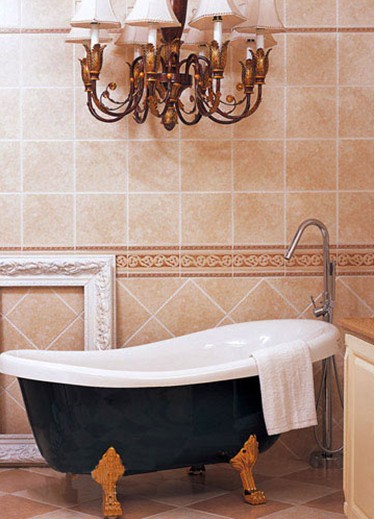 金黃色的浴缸支架,橢圓形的黑色浴缸,色彩相互協(xié)調(diào)搭配,精致典雅,制造出單純的沉穩(wěn)效果。加以歐式古典吊燈點(diǎn)綴,使整個(gè)浴室洋溢著歐式浪漫風(fēng)情,彰顯出大氣華貴美感。