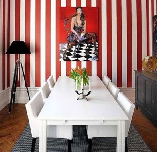 到了以熱情如火的紅色為主題的空間—飯廳了。紅白相間的壁紙,表達(dá)紅色的熱情之余,用白色的冷靜來平衡調(diào)和,減低紅色給人的壓迫感,同時也是另一個白色空間的過渡。值得注意的第一點(diǎn),是壁畫的選擇,壁畫上的黑白地板瓷磚是不是很熟悉呢?