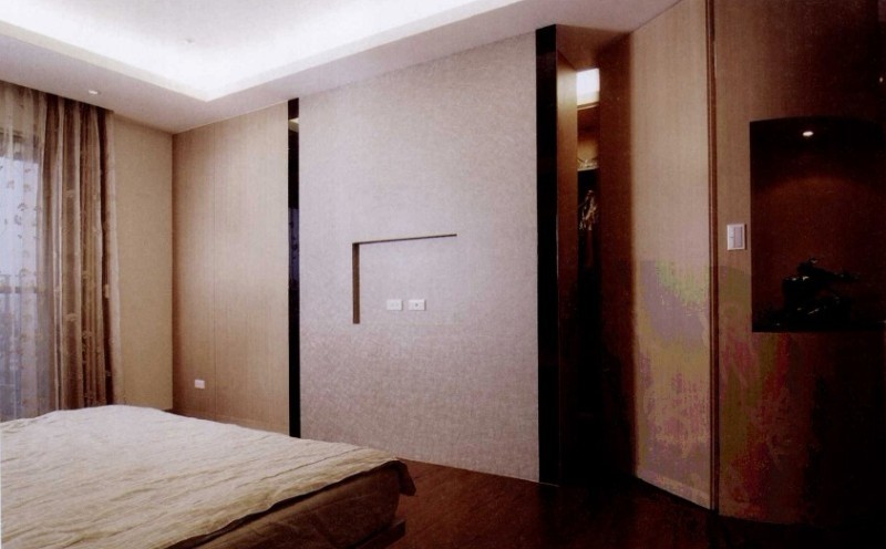 主臥空間因?yàn)榭蛷d背墻而有了內(nèi)玄關(guān),設(shè)計師以弧形包覆有暗門的更衣室,壁化式的設(shè)計讓臥房更具舒適感。同時另設(shè)滑軌層板與隱藏式梳妝臺,讓收納更有效率。