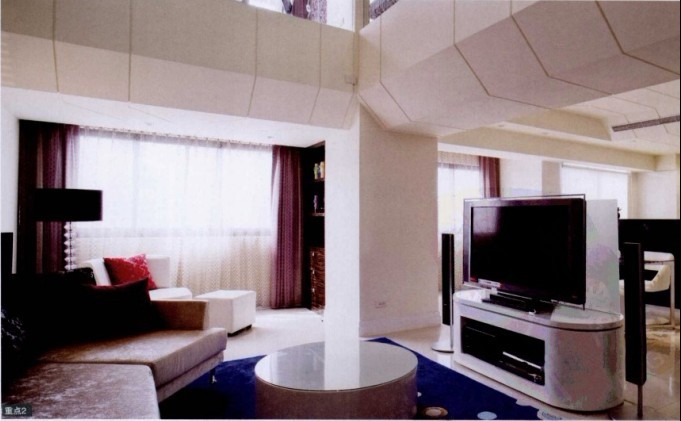 客廳局部挑高的設計,則讓人一進門就感受到空間的氣勢。將電視墻移位,隔開客廳與餐廳。連接墨鏡吧臺的半開放式廚房,讓視覺延伸并展現出空間感。將樓梯規(guī)劃在餐廳旁邊,并作為和室與餐廳的隔間。拿掉樓梯扶手,再用色框裝飾梯階,不但樓梯變得開闊,也成為空間的裝飾藝術。主臥則規(guī)劃在夾層上方,主臥角落為書房及更衣室。