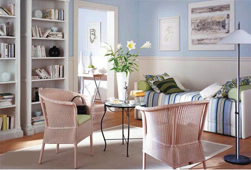 軟裝搭配:天藍色墻漆+淺色藤椅+軟裝飾