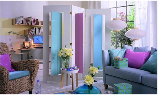 三面色彩屏風作為隔斷,一邊是工作區(qū)域,一邊是休息區(qū),合理的劃分開來,互不影響。客廳色彩的搭配以及鮮花的裝飾,打造出度假風格的客廳,造就了明亮歡悅的心情。
