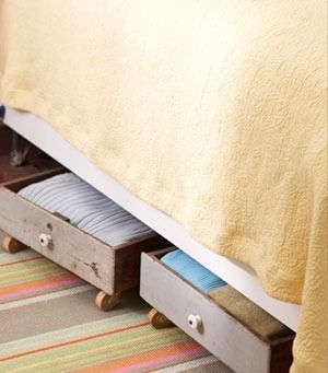 拿舊柜子里的抽屜做收納盒,在五金件市場(chǎng)里購(gòu)買小輪子為其裝上,附在底部的滾輪可以讓它更加自由靈活的移動(dòng)。
