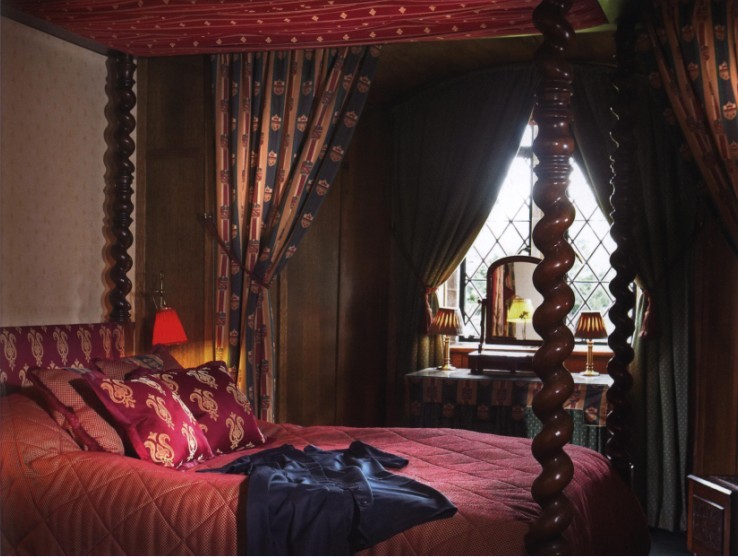 這是一個(gè)古典的臥室,通過帷幔的設(shè)計(jì)將床與整體空間形成既互相融合又彼此獨(dú)立的空間關(guān)系,拉開帷幔,床成為空間的一處陳設(shè)和裝飾元素;閉合帷幔,床又成為一個(gè)獨(dú)立的與外界隔離的私密空間。