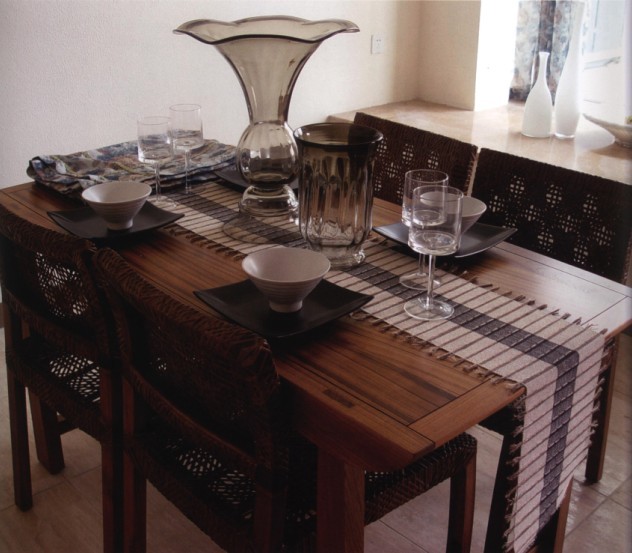在木質(zhì)餐桌上,臺布的存在更強調(diào)其裝飾意味,用類似竹簡的樣式來設(shè)計臺布的造型,與純木的餐桌相搭配,能夠能人以更加真實的復(fù)古的感覺。