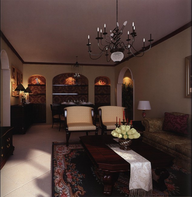 在這個具有經(jīng)典古典風(fēng)格的室內(nèi)設(shè)計中,通過桌布的設(shè)計,為濃重、低沉的棕色主調(diào)增加一抹亮色,進而成為空間中最為配目的一處裝飾。
