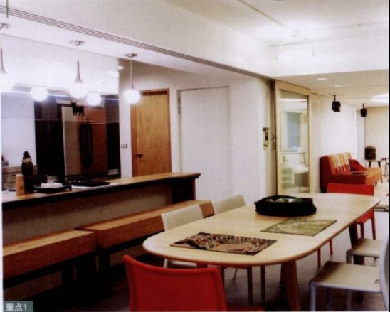 以日式居酒屋為概念設(shè)計(jì)的廚房吧臺(tái),讓屋主可以邊下廚連跟朋友聊天。考慮到廚具以不銹鋼為主,為化解冰冷感,特別以紅色來中紅。而廚房的電器,都以嵌入為主。
