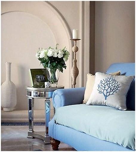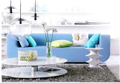 湖藍色布藝沙發(fā)塑造簡單明快的客廳空間,湖藍色的布藝沙發(fā)搭配流行的金屬鏡面茶幾,使客廳整體布置干凈利落,又不失情趣。綠色的抱枕點綴顯得十分搶眼,浪漫的花朵點綴生硬的客廳,增添不少活力,使客廳有種秀色可餐的感覺。