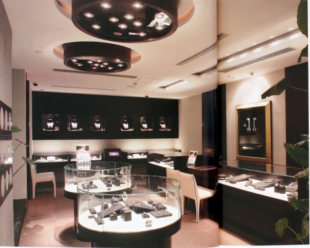 大多數(shù)珠寶店以柜臺(tái)方式展示商品,多選無(wú)色為基色,輔助一些純色作為柜臺(tái),展臺(tái)色來(lái)襯托商品的效果。高檔珠寶店以黑/紅色絲絨或木裝修多見(jiàn)。其中,黑色絲絨為西方傳統(tǒng)用色,紅色為中國(guó)傳統(tǒng)用色高檔珠寶飾品店以洽談形式為方式,商店布置成一個(gè)小型展示。色彩色設(shè)計(jì)的根基來(lái)自于珠寶的風(fēng)格主題。一般古典飾品常用深色系列,加上精致的復(fù)古家具,使人仿佛置身與博物館,而前往時(shí)尚的飾品則表現(xiàn)各自的主題,用原始色彩表現(xiàn)返璞歸真,用冷漠的金屬質(zhì)感表現(xiàn)高科技品質(zhì),用濃重的純色代言”酷“一代玩家的,各種各樣無(wú)奇不有。