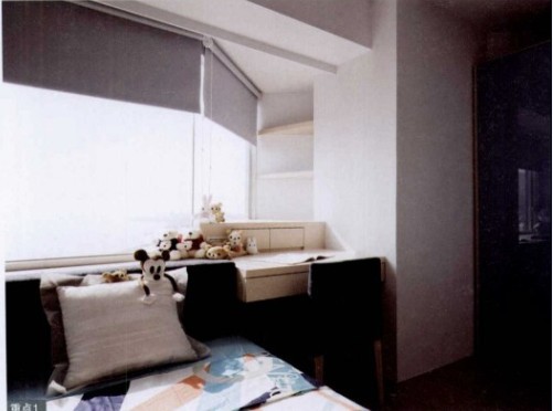 臥室由結構產生了畸零空間,設計師因此在窗前設計書桌,再利用階梯的概念將收納柜體向上延伸,將空間難題完美地解決。