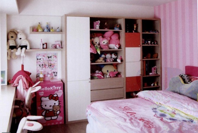 小女孩都喜歡布偶,設計師選擇粉紅色作為空間的主色,為布偶設計了收納展柜,并用白與紅的門片跳色,讓布偶成為公主房里最好的裝飾風景。