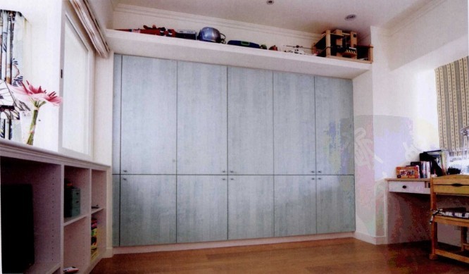每個(gè)房子可能或多或少都會(huì)出現(xiàn)畸零空間,應(yīng)該多利用這些空間的使用。男孩房的柜體止方有梁柱,因此設(shè)計(jì)有層板,一來(lái)滿足收納功能,二來(lái)則可以遮蔽梁柱。
