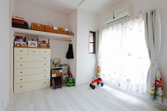 白色的薄紗窗簾使房間內(nèi)的陽光不再耀眼,印花的圖案也讓孩子們非常喜歡。而選用白色的地板來提高房間的明亮度,又能營造出輕松舒適的氛圍。利用房間的凹凸度,打造出一個小型的儲物場所。隔板上面擺放幾個竹編的儲物筐,放些不太常用的物品。下方只用一根鋼管便變成了簡易的衣架,既簡便又非常有實用性。乳白色的儲物柜,收納功能強,又可使物品分類擺放便于翻找。再擺放幾張溫馨的全家福照片,這樣的空間,孩子怎么會不喜歡呢!