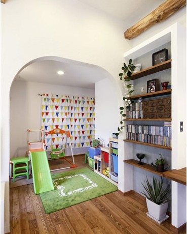 開放式的拱形門,既不會讓空間的過渡變得突兀,又很好的增加了房間的延伸度,不會給人狹小的感覺。柔軟的綠色地毯既與小型的滑梯和秋千色彩融合,也增添了孩子玩耍時的安全感。彩色旗幟的窗簾頗具特色,既有實用性,也符合了孩子喜歡鮮艷事物的口味。木板打造的簡易書架,與綠色植物的裝飾更為空間整體添加了自然的氣息。