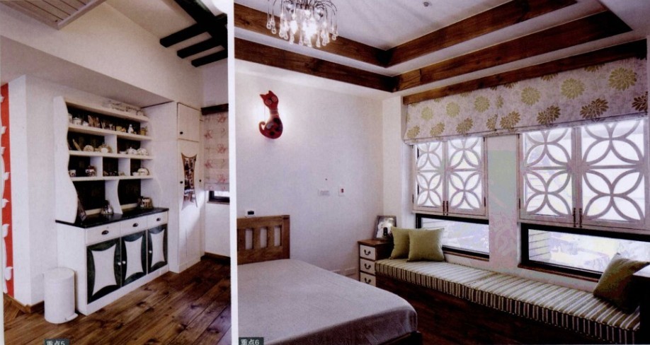 并開放式的綠色與白色的美式餐柜,讓廚房的收納更為充足,而且還可以用來擺放屋主的收藏品,旁邊則連接落地式白色收納柜,加大收納空間。主臥窗戶下面設(shè)計了一張長椅,比窗臺要低,下方是格子空間,用來收納用,在長椅的兩邊還設(shè)計了小抽屜柜,用來存放小件物品。