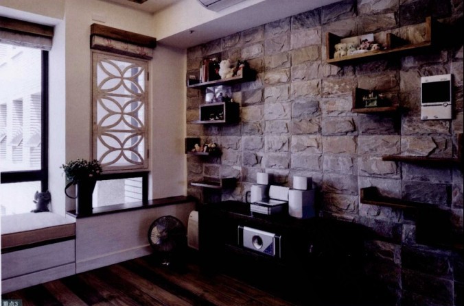 客廳的電視墻用天然石材拼貼而成,墻上不規(guī)則排列的展示架,用來擺放收藏品。MM說不能擺放太貴重或易碎的物品,因為這里也是貓貓的跳臺,它喜歡在這里玩。
