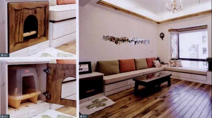 對養(yǎng)貓的MM而言,貓便便用的砂盤收納是最大的問題,這里設(shè)計師利用客廳沙發(fā)實木邊幾下方將其收納,除此之外,設(shè)計師還用松木量身定做沙發(fā),沙發(fā)的下面全部都是空的格子間,用來收納用。