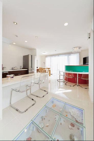 三、整個空間的通透感很強,你會覺得這個空間很透氣。其實只是設計師耍了點小小的把戲。在這個空間里相信大家都注意到了地面采用了玻璃的形式,里面放點細沙、貝殼、珊瑚配上淡藍色的玻璃,會有種大海的感覺,這樣售房整個開放式的廚房地面不在單調。