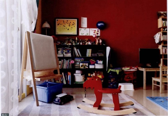 由于家人在客廳活動(dòng),所以特別在角落里規(guī)劃小孩專屬的游戲及閱讀空間,為了配合小孩的身高,書柜或置放玩具的柜子都設(shè)計(jì)得較矮,讓他們從小養(yǎng)成自己的習(xí)慣。